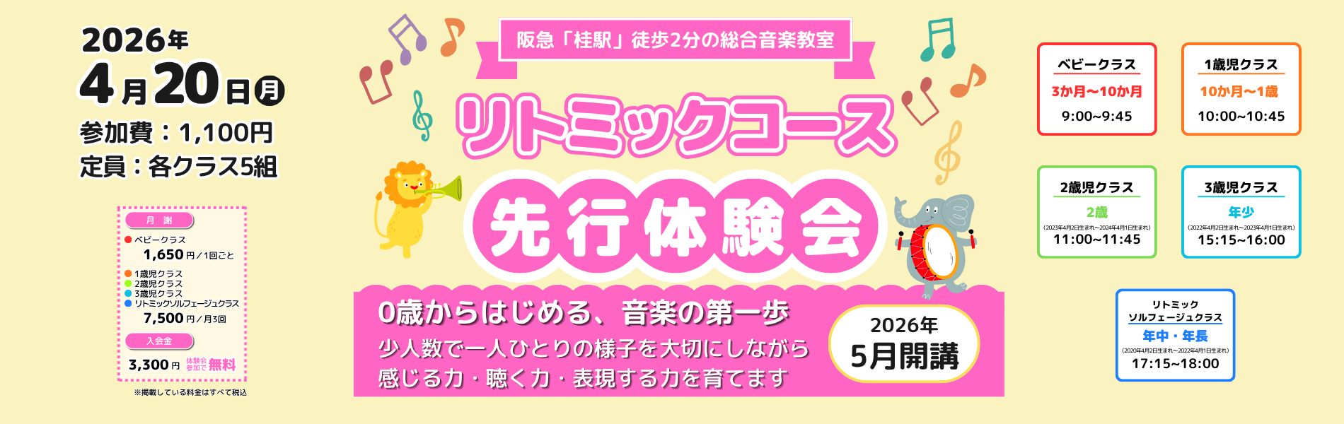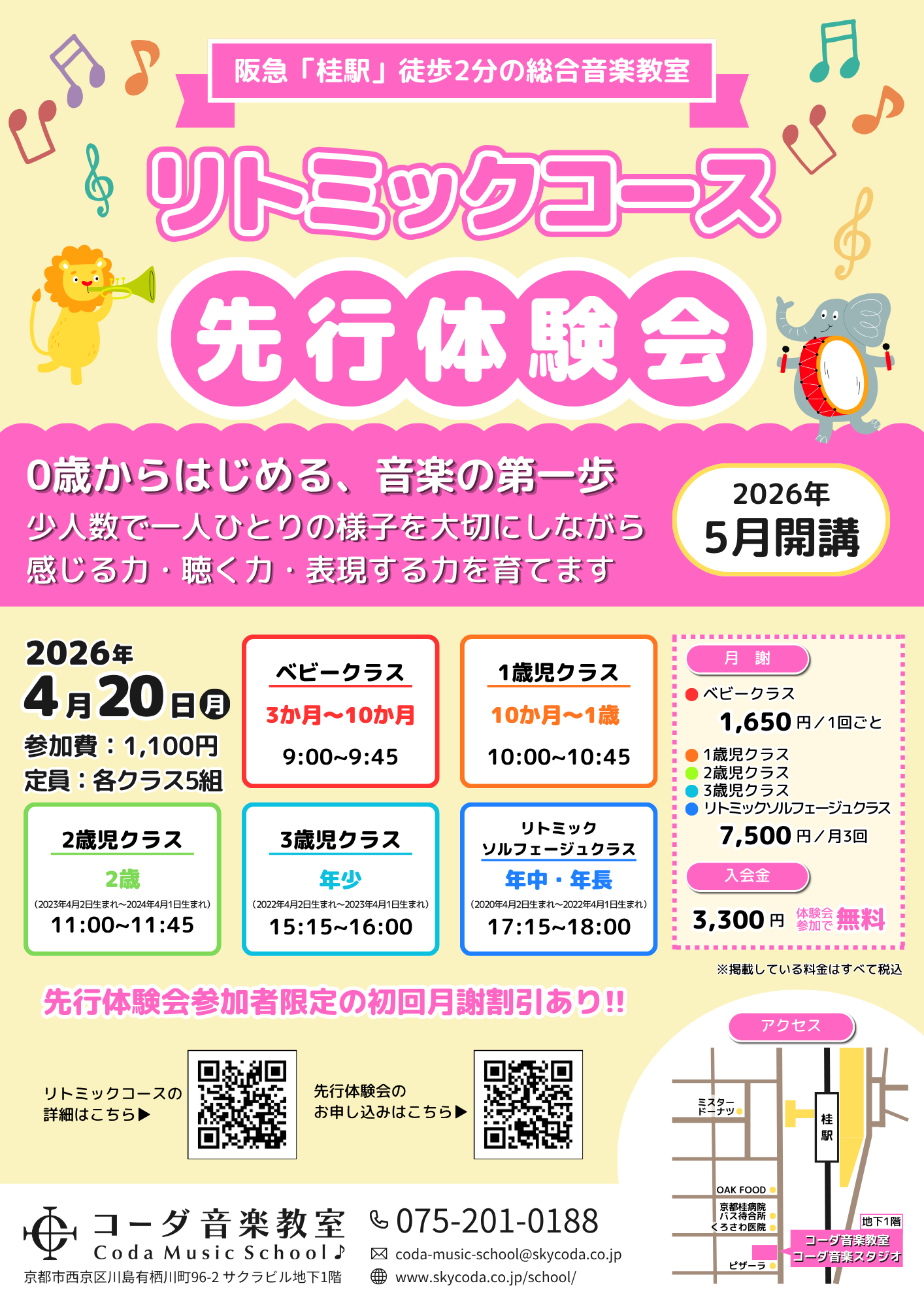 コーダ音楽教室では、2026年5月よりリトミックコースを開講いたします。開講に先立ち、2026年4月20日(月)に先行体験会を開催いたします。各クラス定員は5組、参加費は1,100円(税込)です。