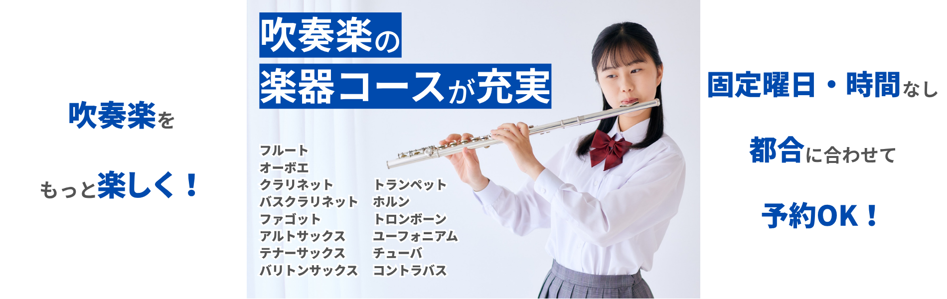 部活動ではカバーしきれない基礎・表現・ソロ対策を、経験豊富な講師がマンツーマンでサポート。中高生を中心に、吹奏楽部員の力をしっかり伸ばします。