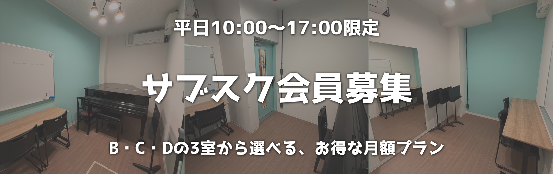 個人練習はもちろん、アンサンブル・伴奏合わせ・声楽練習・楽器レッスンにも対応。グランドピアノ常設スタジオもございます。